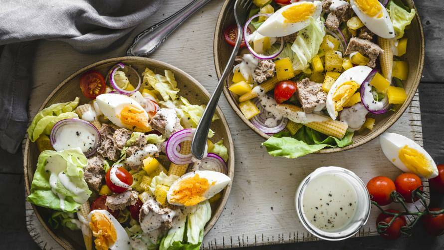 Klar, Salate gehen immer. Achte nur darauf, dass das Dressing selbstgemacht ist und kein Zucker verwendet wurde. Am besten eignet sich einfach der leckere Essig-Öl-Klassiker. Croutons solltest du in jeder Form weglassen, die sind meistens auch voller Zucker und Kohlenhydrate. Ansonsten steht deinen Wünschen nicht viel im Weg: Käse, Schinken, Thunfisch, Oliven, Hähnchen und Ei – pimpe deinen Salat mit allem, was dich glücklich macht.