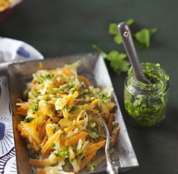 Kohlrabi und Möhren schälen und in der Küchenmaschine oder mithilfe der Küchenreibe grob raspeln. Die Gemüseraspel mit Zucker und 1 Prise Salz in einer Schüssel vermischen. Raspel für 5 Min. beiseitestellen, damit sie Saft ziehen.