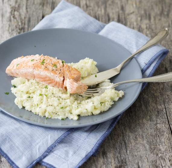 Lachs mit schnel­len Ge­mü­se­spa­ghet­ti in cre­mi­ger Sah­ne­sau­ce